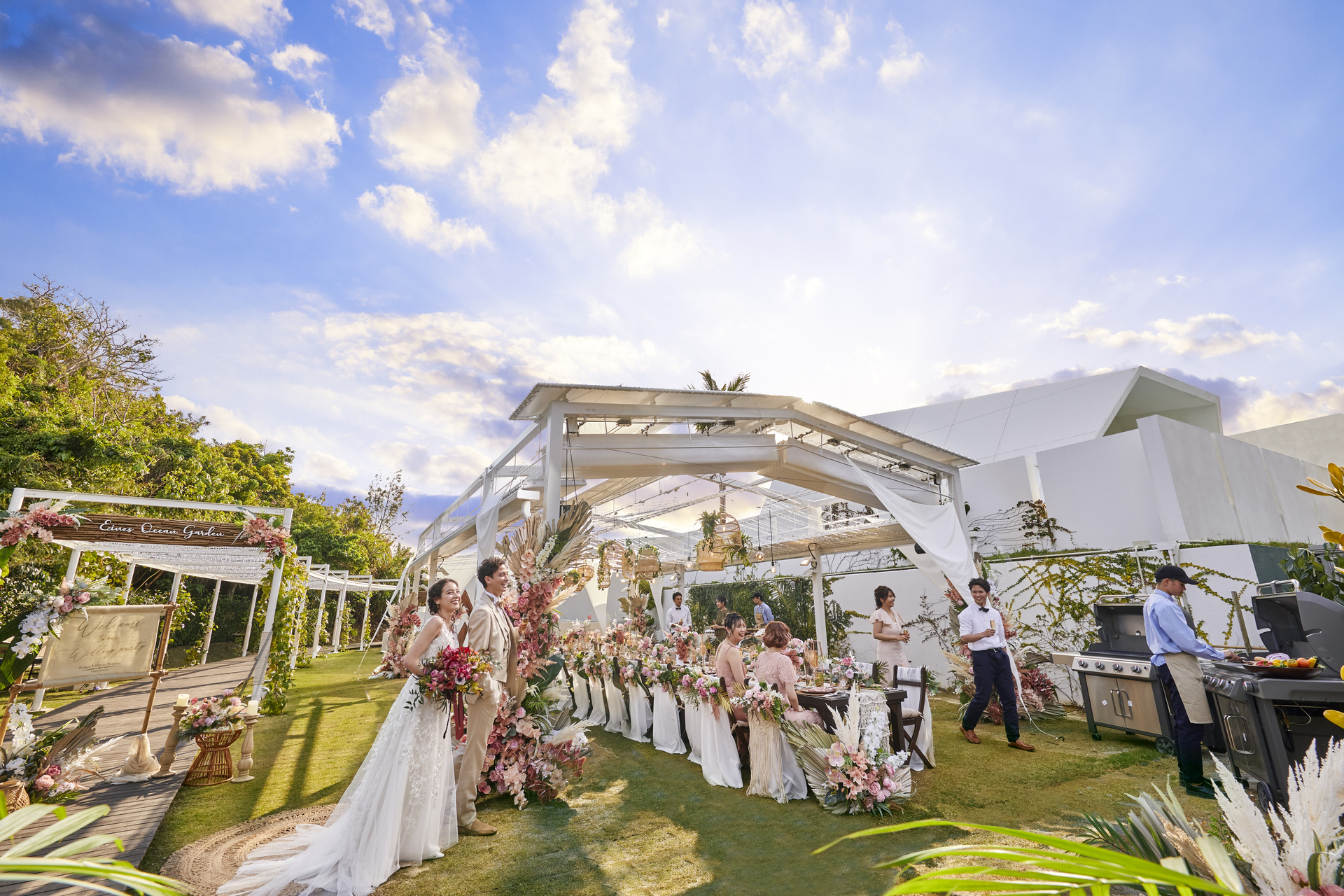- 目の前に海が広がる「五感の教会」で愛を誓い、ビーチで写真撮影。