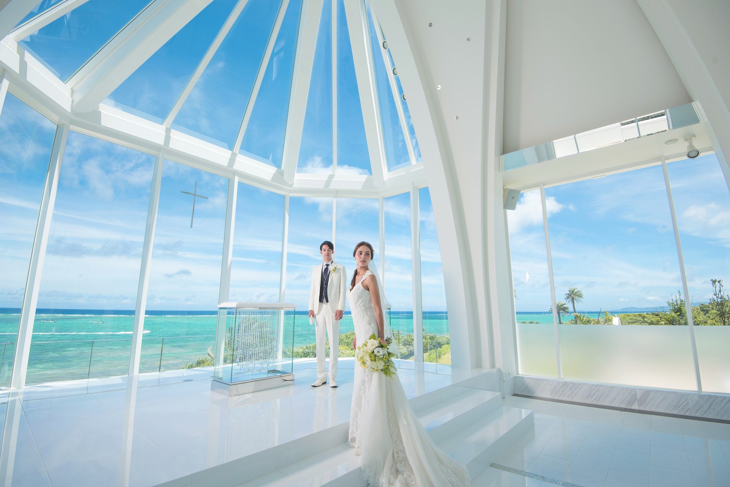 美しく感動的なマリンビューに包まれた純白チャペル。天井も高く、開放感あふれる空間