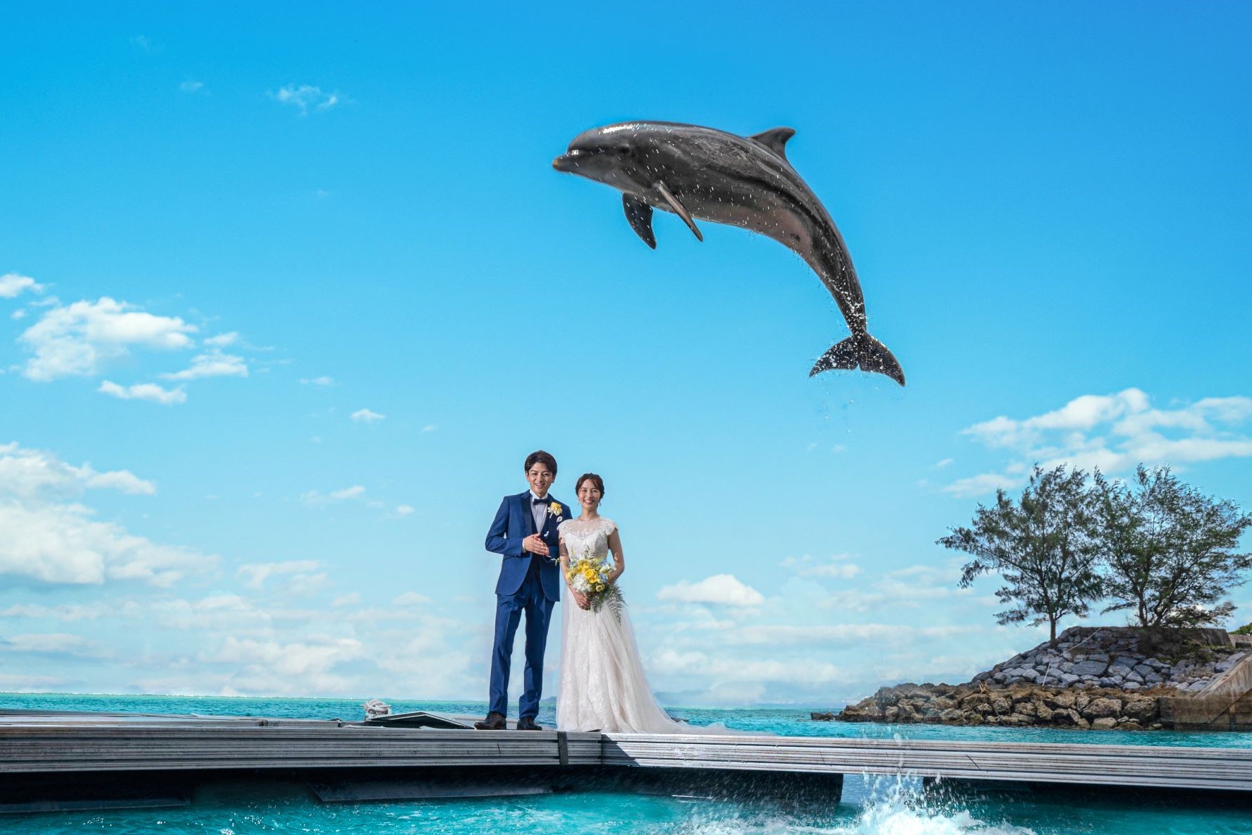 イルカがふたりの目の前でジャンプ&握手!ドレス姿でイルカと一緒に撮影ができるのは沖縄ではここだけ!