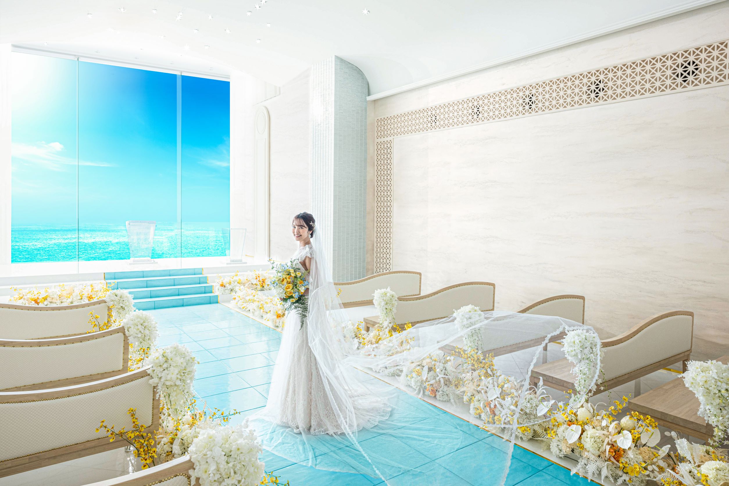礼拝堂はまるで海の中の教会で愛を誓うかのような青と白の幻想的な空間