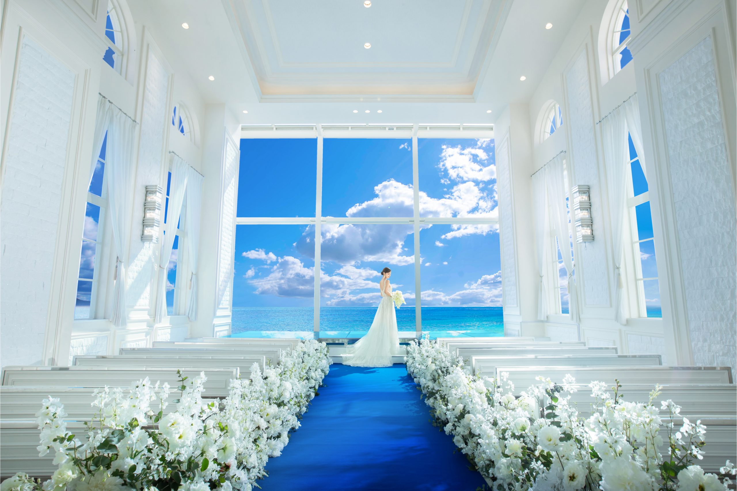 大きな3面窓から美ら海を臨む白亜のオーシャンビューチャペル。