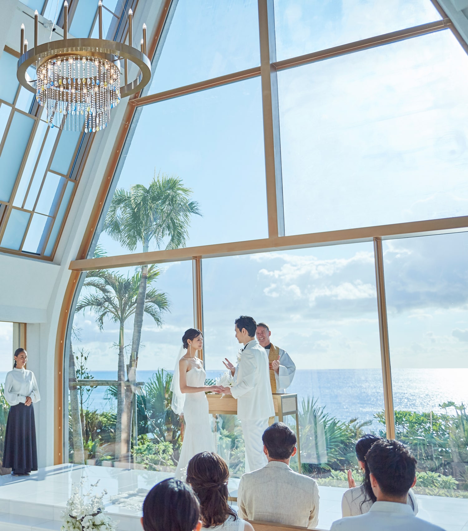 琉球ガラスが輝くシャンデリアに光を注ぐのは、それぞれ異なる形をしたガラスの天窓。開放感が心地良い三角屋根のチャペルで、一生に一度の誓いを。