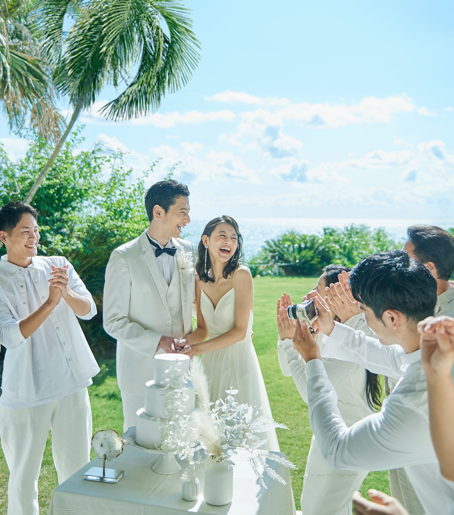 沖縄の旬の食材で仕立てたこだわりのフレンチやプライベート感あるパーティ会場で大切な人と過ごす時間は心地よいひととき。最高の景色の中で行うケーキカットも一生の記憶に。