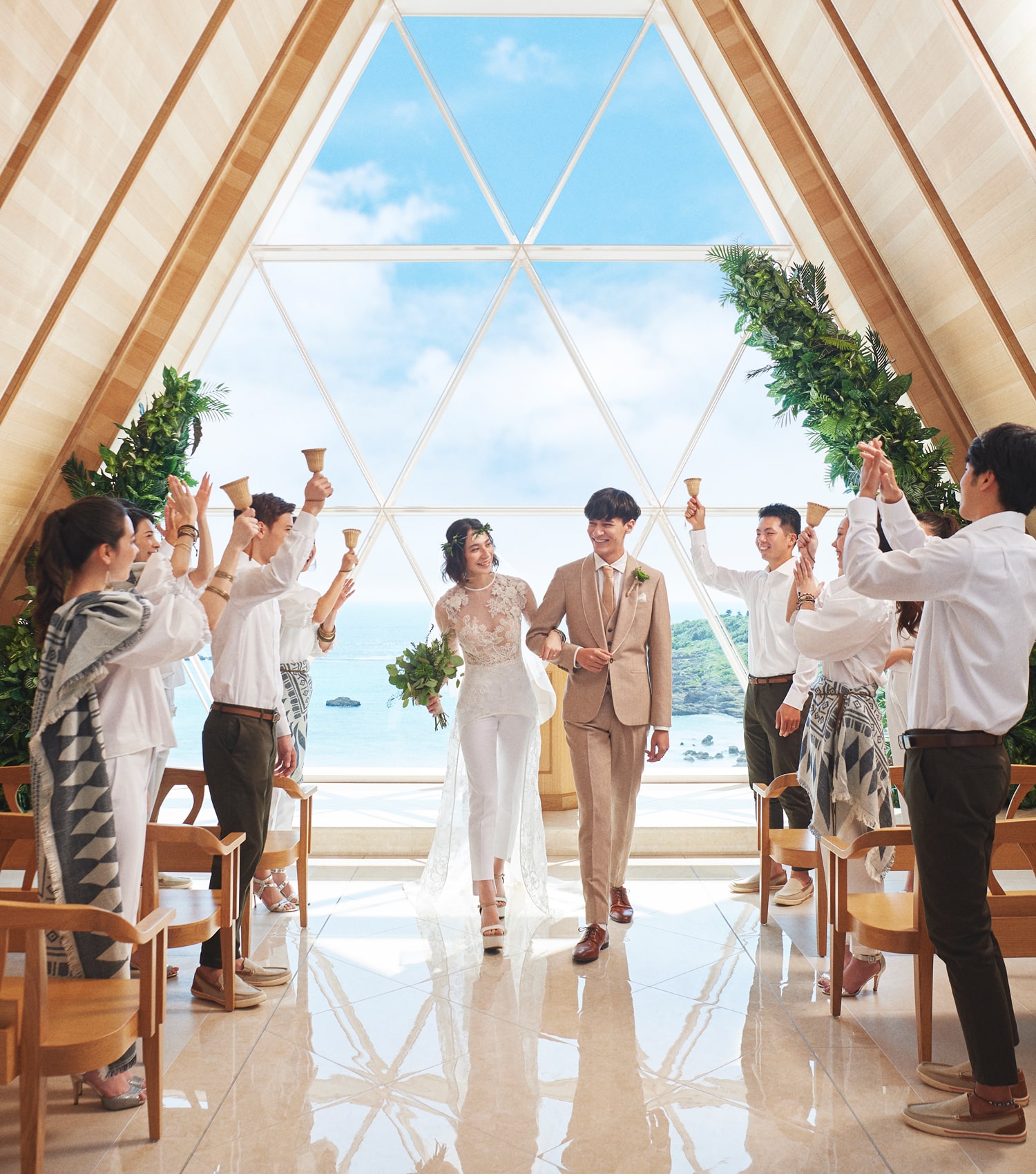 遥かな絶景を眺めながら美しい“音”が響く挙式を。永遠の誓いを祝福するシンガーによる歌と、ゲストが奏でる波の音と拍手がおふたりを温かく包みます。