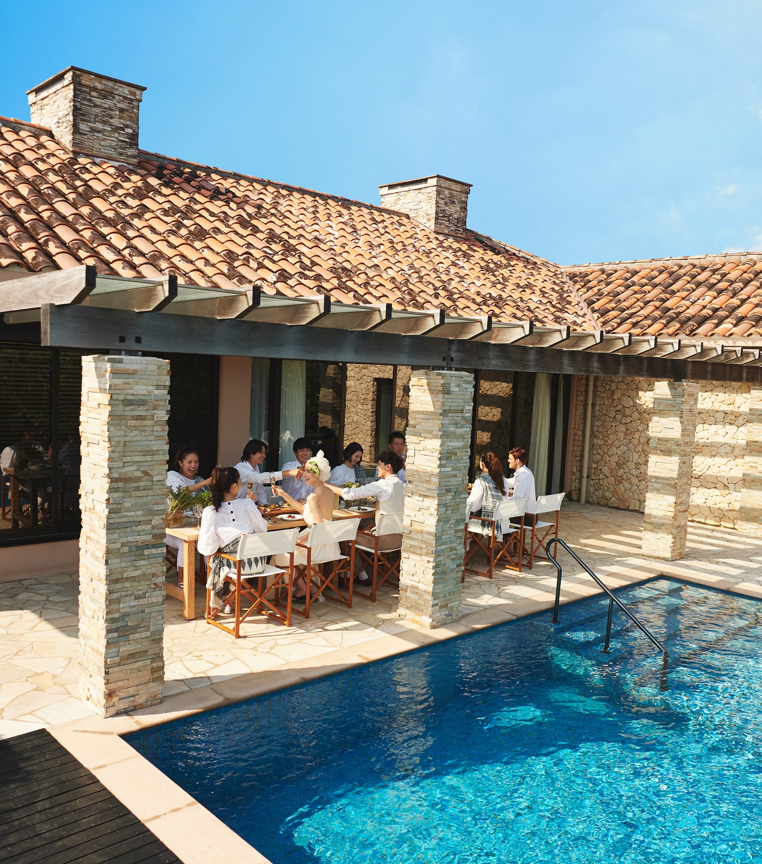 邸宅スタイルの「プレミアハウス」を貸し切って、自宅のようにゲストを迎えて。ひとつのテーブルを囲み、笑い声が尽きないアットホームなパーティを。