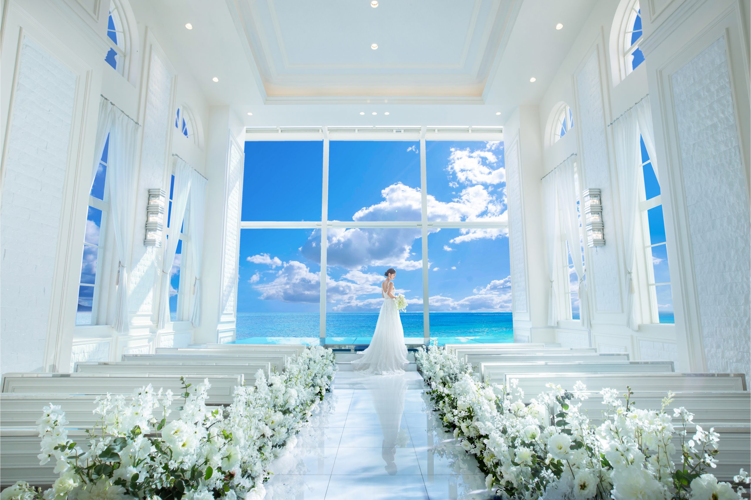 ビーチや沖縄の自然豊かなスポットでの撮影はもちろんの事、沖縄の海が一望出来る本物のチャペルでの撮影プランもご用意。