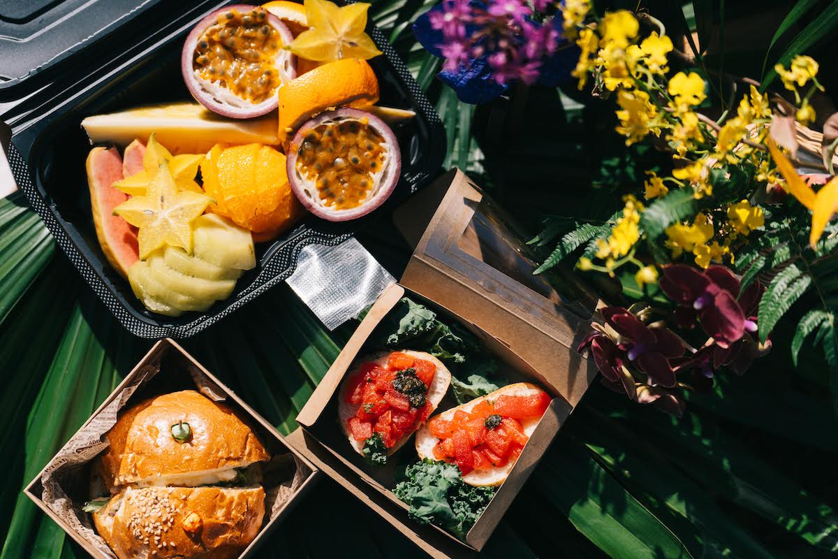 ボリューム満点のハンバーガー、彩り豊かなオープンサンド、新鮮なフルーツやサラダ。