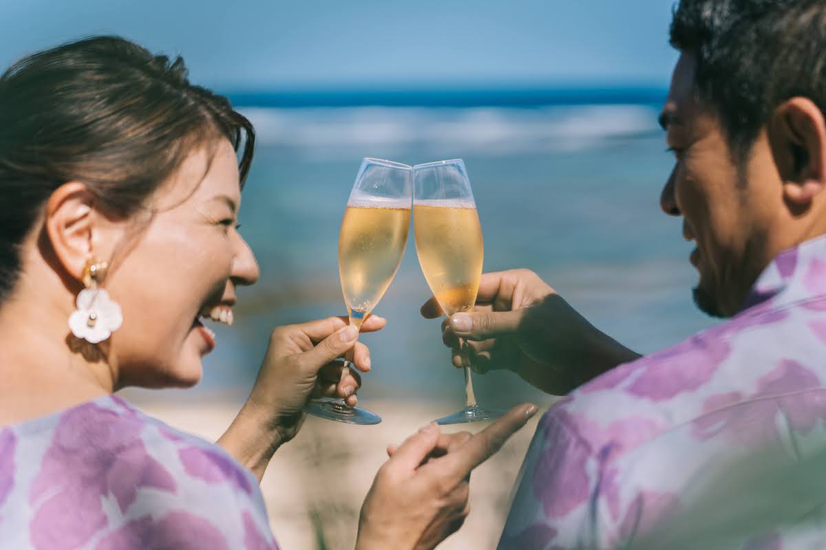 青い海と空を独り占めするビーチに、ふたりのためだけのテーブルが丁寧に設えられます。
